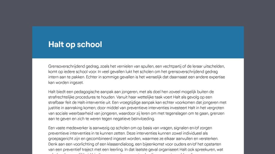 Een gezamenlijke afweging en inzet van Halt: spreekuren en voorlichting op scholen binnen Sittard-Geleen. De inzet van Halt op school draagt bij aan de weerbaarheid van jongeren en aan het verminderen van grensoverschrijdend gedrag en schoolverzuim.