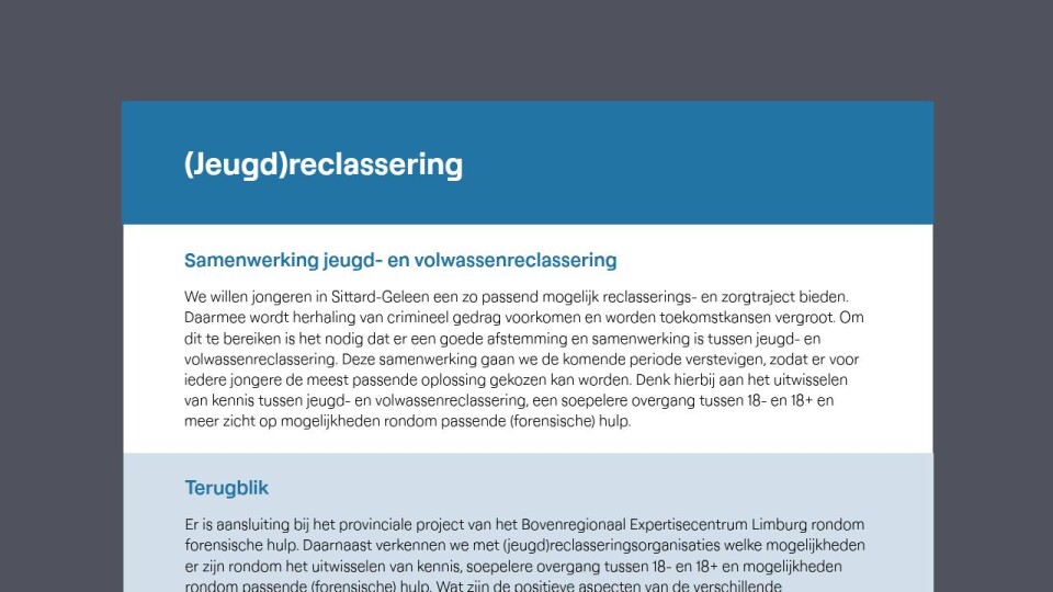 We willen jongeren in Sittard-Geleen een zo passend mogelijk reclasserings- en zorgtraject bieden. Daarmee wordt herhaling van crimineel gedrag voorkomen en worden toekomstkansen vergroot. Om dit te bereiken is het nodig dat er een goede afstemming en samenwerking is tussen jeugd- en volwassenreclassering. Deze samenwerking gaan we de komende periode verstevigen, zodat er voor iedere jongere de meest passende oplossing gekozen kan worden. Denk hierbij aan het uitwisselen van kennis tussen jeugd- en volwassenreclassering, een soepelere overgang tussen 18- en 18+ en meer zicht op mogelijkheden rondom passende (forensische) hulp.