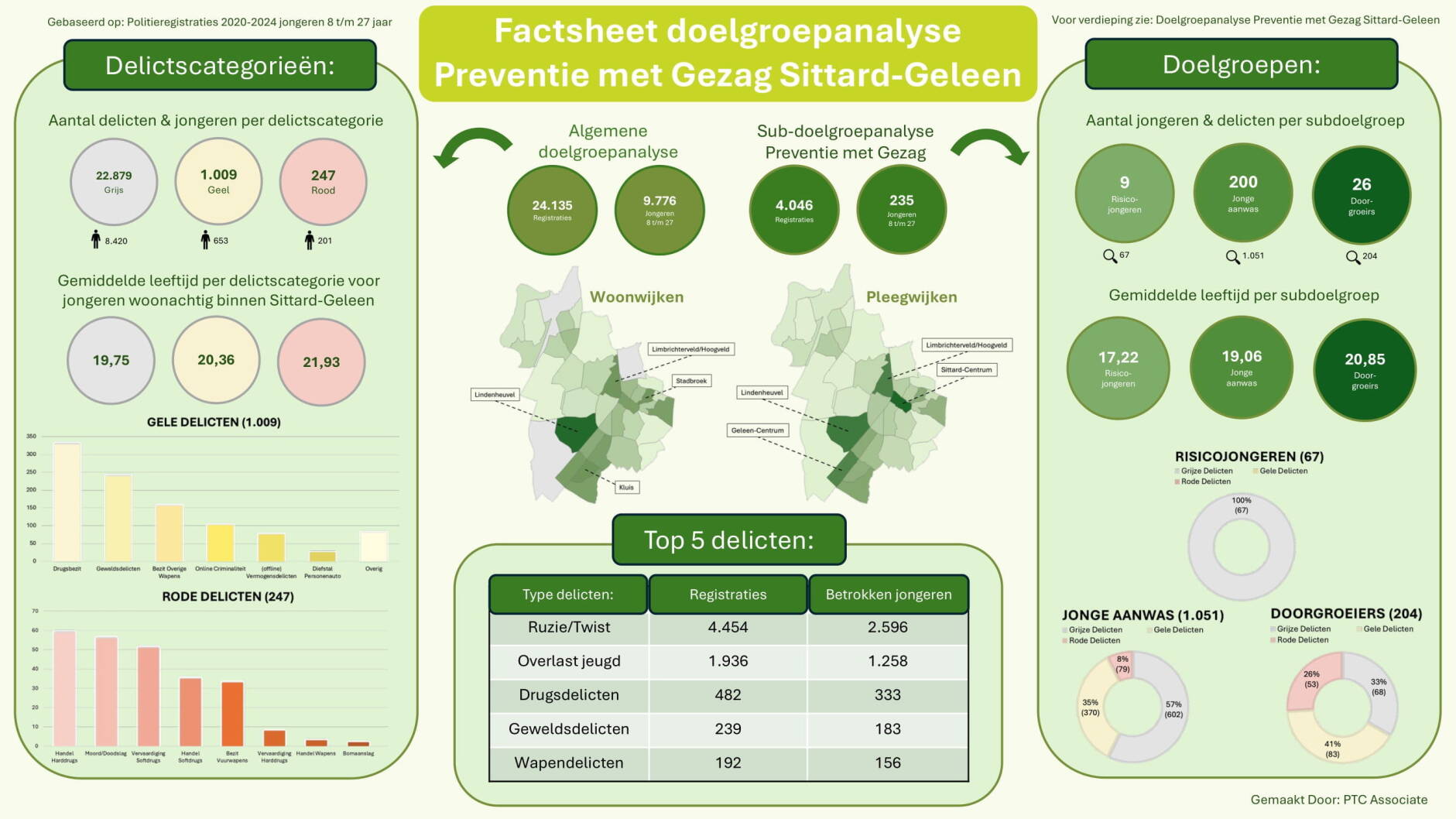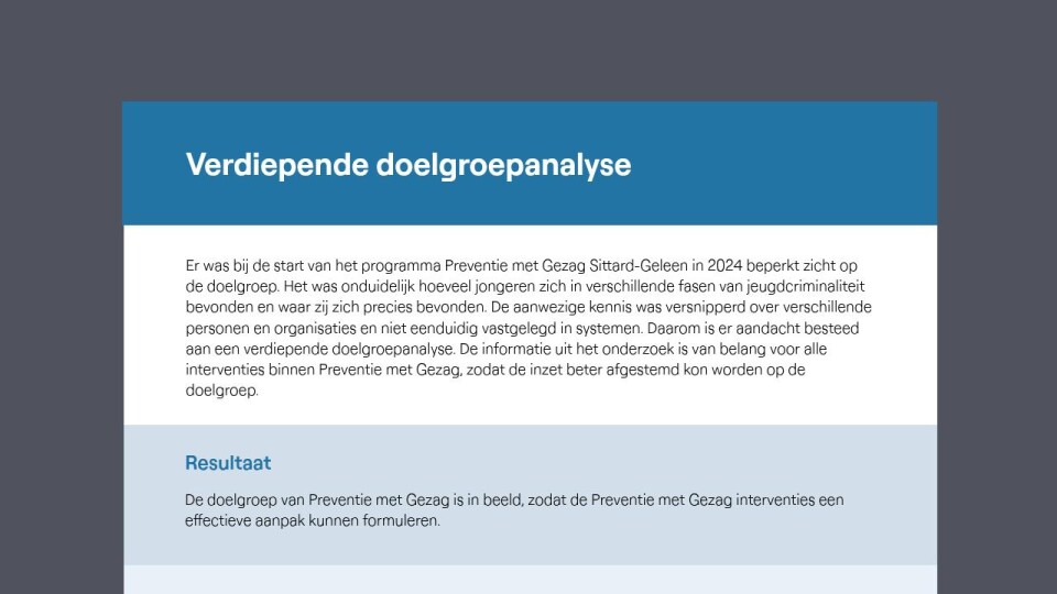 Er was bij de start van het programma Preventie met Gezag Sittard-Geleen in 2024 beperkt zicht op de doelgroep. Het was onduidelijk hoeveel jongeren zich in verschillende fasen van jeugdcriminaliteit bevonden en waar zij zich precies bevonden. De aanwezige kennis was versnipperd over verschillende personen en organisaties en niet eenduidig vastgelegd in systemen. Daarom is er aandacht besteed aan een verdiepende doelgroepanalyse. De informatie uit het onderzoek is van belang voor alle interventies binnen Preventie met Gezag, zodat de inzet beter afgestemd kon worden op de doelgroep.